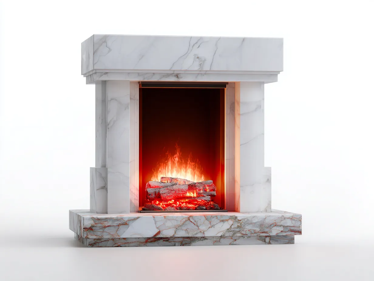 Dieser Kamin in Marmoroptik setzt einen eleganten Akzent im Wohnbereich und eignet sich als dekoratives Einrichtungselement für Wohnzimmer, Schlafzimmer oder Empfangsräume. Die klare Formgebung und die markante Feueröffnung sorgen für eine klassische Ausstrahlung und schaffen eine warme visuelle Präsenz im Raum.